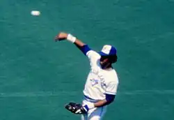 Bell's first season as a regular was in 1984, and he finished his first full season batting .292 with 26 home runs and 87 RBI in 159 games.[1] That season, he first teamed with fellow outfielders Lloyd Moseby and Jesse Barfield. That outfield, along with solid starting pitching, led the Blue Jays to their first-ever American League East division title in 1985. Bell caught a fly ball, off the bat of Ron Hassey, for the final out in the 5–1 victory over the New York Yankees on October 5, clinching the division title for the Blue Jays.[5] Despite Bell's .321 average in the ALCS, they lost the series to the Kansas City Royals.[1] His best season came in 1987, although the Blue Jays fell two games short of the Detroit Tigers in the division race.[6] Bell finished with a .308 batting average, .352 on-base percentage, .608 slugging percentage, 111 runs, 47 home runs, a league-leading 134 RBI, and a major-league leading 369 total bases in 156 games.[1] He was awarded the American League MVP award that year.[7]