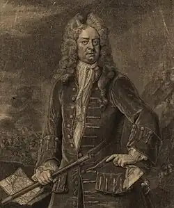 The war in Ireland ended with the October 1691 Treaty of Limerick and the regiment was sent to Flanders, where it spent the rest of the Nine Years' War; Carpenter was promoted lieutenant-colonel in January 1692.[7] After the 1697 Treaty of Ryswick, his regiment returned to Ireland as part of the garrison; in 1703, Carpenter used his wife's dowry to buy lands in County Kilkenny and became MP for Newtownards in the Parliament of Ireland. He also purchased colonelcy of the 3rd The King's Own Hussars for 1,800 guineas, a position he held until his death in 1732.[8]