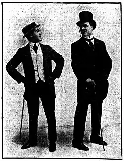 George Clarke and Tom Mostol arrived at Adelaide from London aboard the steamer R.M.S. Mongolia and made their Australian debut on 5 August 1911 at Adelaide's Tivoli Theatre.[13][7][8] A reviewer for The Bulletin commented that Clarke and Mostol "have nothing new to show, but their step-dancing, single or double, is very good, and their cross-talk amusing". The writer gave an example of their comedic patter: "I planted a dead cat in my garden, and up came – a sanitary inspector".[14] After a fortnight in Adelaide the two comedians travelled to Sydney and made their first appearance at the Tivoli Theatre in Sydney on 19 August.[15] A reviewer for a Sydney newspaper described their act: "Made up as dudes, they succeeded with their comedy dances and clever patter in keeping the audience in shrieks of laughter, while their exhibition of fine dancing fairly 'brought down the house'".[10] Another reviewer described Clarke and Mostol's performance as "a sort of brief Baccanalia of mirth and motion". The writer singled out Clarke as the more accomplished of the two entertainers: "... but the gentleman with the giggle and the eyeglass is perhaps the easier, the less strained, of the two".[16] Clarke and Mostol were featured in the programme of acts presented by Rickards at the Opera House in Melbourne from early October 1911.[17]