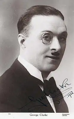 Later, as George grew to adulthood, the father-and-son partnership was billed as 'Clarke and Clements'. In 1910 George's father retired from the stage to become a publican and George (junior) took on the stage-name of 'George Clarke' and adopted the on-stage persona of a 'dude comedian'.[4][3][1] The 'dude comedian' was a popular on-stage persona in music hall tradition, a working-class send-up of the upper classes, embodied as the well-dressed toff with monocle and top hat who indulged in routines of verbal nonsense.[5] In a summary of his career published in The Performer magazine in 1946, it was said of Clarke: "He was a master in the art of giving full rein to the most priceless verbal inanities, was always impeccably attired on the stage, and with his monocle typified the 'silly ass' character so vastly enjoyed by the average man in the street".[3]