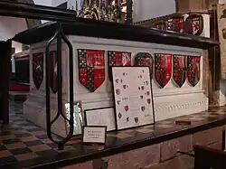 George Clifford died on 30 October 1605 at the duchy house of the Savoy in London. His body was embalmed and buried in the family vault at Skipton Castle in Craven, Yorkshire, his family seat, where a black marble altar tomb to his memory was erected by his daughter, Lady Anne Clifford.[1] Also, his chest tomb monument survives in Holy Trinity church, Skipton, adjacent to the castle. It is profusely decorated with heraldry, showing the arms of Clifford quartering Vipont (the feudal barons of Appleby, from whom the Cliffords inherited Appleby Castle and vast estates in Westmorland), impaling the arms of Russell as well as the wives of Clifford's paternal predecessors: Beauchamp, de Roos, Percy, Dacre, Berkeley, Neville, etc.