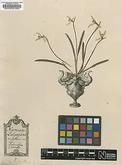 A pressed specimen of Galanthus nivalis (ref: NHM BM000558558) from the herbarium, mounted using a label made to look like an urn.