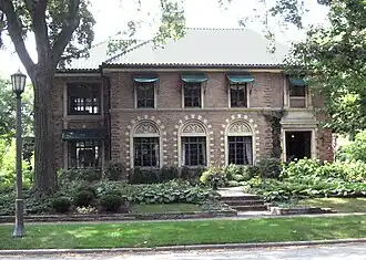 The George E. Purple House is a historic home located at 338 Sunset Ave. in LaGrange, Illinois, United States. The Italian Renaissance Revival style house was designed by William G. Carnegie and built in 1928. The house includes several characteristic features of Italian Renaissance Revival architecture, including a green tile hipped roof, large first-floor windows, overhanging eaves, decorative brackets, and extensive decorations; these decorations include bas-relief urns above the first floor windows and brick quoins on the corners. George E. Purple, founder of the Flexible Steel Lacing Company, commissioned the house; while Purple died in 1930, his family inhabited the house until 1944.[2]
