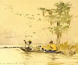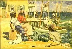 In 1901 a German art annual reported that he had been spending most of the year sailing along the coasts of New England, the Gulf of Mexico, and the Mississippi. Its reporter said he spent his time painting, "drawing his subjects now from groups of lounging Mexicans, now from sober Gloucester fishermen, or from New Orleans Italian dock workers."[33] When Clements traveled to New Orleans, he often painted genre and landscape watercolors at a plantation near Opelousas, Louisiana, that was owned by members of his mother's family, the Toledanos.[5][34]
