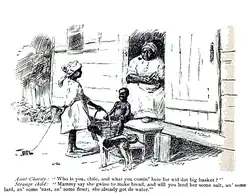 In 1896 Clements wrote and illustrated an article for Symposium magazine called "Extracts from a Plantation Sketch-Book". The piece deals mainly with pigs and other plantation animals. In comparing the fat pigs raised by White planters with the scrawny razorbacks raised by the plantation's Black cabin-dwellers, he contrasted the plantation's dyspeptic bosses with the "well-nourished and muscularly powerful" field hands.[56]: 120–121  Clements also illustrated a story in that issue. Called "Queen-Esther's Chris'mus Gif" and written by Alice Gale Woodbury, it was a sentimental tale, told largely in Black dialect, about a Christmas gift from a kindly White woman to the disabled daughter of a Black laundress.[56]: 113–115  Clements contributed a drawing to another issue of the magazine. Its caption concerned the surprise of a Black woman named Aunt Charity when a young girl came by to say, "Mammy say she gwine to make bread, and will you lend her some salt, an' some lard, an' some 'east, an' some flour; she already got de water."[56]: 42