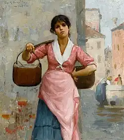 In 1886, while Clements was studying at Académie Colarossi, the art gallery of the Southern Exposition of Art, Industry, and Agriculture in Louisville, Kentucky, put two of Clements's paintings on display; one, a portrait, and the other a view of Venice.[13] That year, he also began a career as an illustrator when a popular author, Elizabeth Stuart Phelps, asked her publisher to hire him and another artist to illustrate one of her best-known stories, "The Madonna of the Tubs".[14][15]