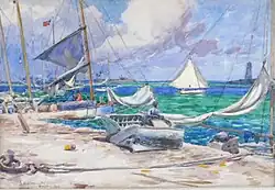 Clements made both oil and watercolor paintings. Critics noted his skillful handling of color in both mediums but generally considered the subdued tones of his oils to be outmatched by the bright hues of the watercolors.[28][44][47][48] Although he made some early portraits, outdoor scenes dominate his work. These were seascapes, often showing sailboats; genre scenes, often showing manual laborers; and landscapes, often of coastal subjects.[35][48][49]