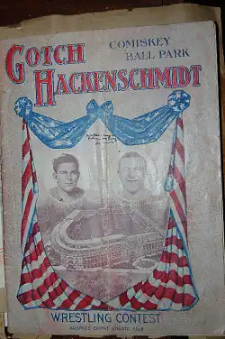 Hackenschmidt and Gotch met again on 4 September 1911, at the newly opened Comiskey Park in Chicago, which drew a crowd of nearly 30,000 spectators and a record gate of $87,000. The rematch is one of the most controversial and talked about matches in professional wrestling history, as Hackenschmidt claimed to have injured his knee against Dr. Roller, his chief training partner. Years later, professional wrestler Ad Santel told Lou Thesz that he was paid $5,000 by Gotch's backers to cripple Hackenschmidt in training, and make it look like an accident.[26] However, according to Hackenschmidt himself, the injury was accidentally inflicted by his sparring partner, Roller, when trying to hold Hackenschmidt down onto his knees in the down position. Roller's right foot struck Hackenschmidt's right knee, which in 1904 had developed "Housemaid's Knee", requiring treatment, and had acted up again in 1907. Furthermore, according to Hackenschmidt, his sparring partners for this match were Americus (Gus Schoenlein), Jacobus Koch, Wladek Zbyszko and Roller. Ad Santel is not mentioned in any account of Hackenschmidt's training by either Hackenschmidt or Roller, both of whom offered their insights and accounts.[27]