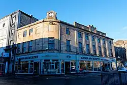 The George Hotel was erected at the corner of George Street and Portland Street in Kilmarnock in 1823.[2] It is widely speculated that Glaswegian architect John Thomson designed the building due to its distinguishable six iconic pilasters and public clock over the curved facade of the building.[3]