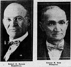 Hampton did not run for re-election in 1929. Dale announced his candidacy that March.[36] He ran as a Democrat in a mostly Republican city; both parties had internal rifts.[3][36] Dale won the Democratic primary by a large margin despite opposition from the party establishment. He then called for the resignation of the chair of the Muncie Democratic Party, J. Wilbur Sims; after he refused to resign, Dale's faction held an election for a rival chair.[36] The Republican Party nominated businessman Robert Denver Barnes, who had the support of influential people such as the Ball brothers whom Dale had criticized.[25][36] Republicans of the anti-Williams-Hampton faction, who had supported Calvin Faris in the primary, did not endorse Barnes, and some endorsed Dale.[36]