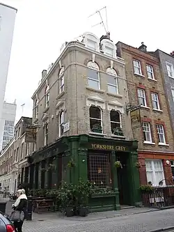 Treacher practiced as an architect and surveyor. He was particularity known for his designs for public houses which included The Opera Tavern (1879) in Catherine Street, London.[3] He also designed the Britannia Public House (1881) at 45 Peckham High Street which has since been converted to a shop and the front lost,[4] and the Yorkshire Grey on the corner of Langham Street and Middleton Place, rebuilt in 1882–3 to designs by Treacher.[5]