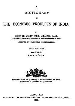 - ^ Chakravarthy, R.S. (1975). "Watt's Dictionary: A Landmark in the Study of the Economic Plants of India". Economic Botany. 29 (1): 31–38. doi:10.1007/bf02861253. JSTOR 4253561. S2CID 12513.