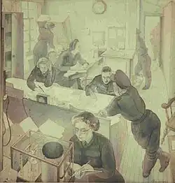 Between his portrait of his two-year-old son Peter One Morning (completed in 1950) and Killerton from the North (1979), however, there was a gap of many years during which he pursued his career as illustrator and cartoonist. He went back to printmaking with great enthusiasm in the late 1970s, exhibiting his works both new and old at the Royal Society of Painter-Etchers and Engravers.[2][12] Among his later prints are portraits of John Ogdon (1979) and Patricia Beer (1982).[11]