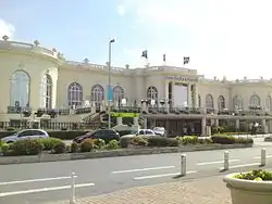 Wybo designed the Hotel George V near the Arc de Triomphe for the American hotelier Joel Hillman in 1928. The hotel has a huge marbled foyer, a large anteroom and a huge interior corridor, so it could accommodate a crowd of visitors with their luggage.[7] In 1929 Wybo designed the Hôtel du Golf in Deauville.[2] He designed the French pavilion at the 1929 Barcelona International Exposition, located in the Plaza de los Reyes in the angle formed by two naves of the Palace of Alfonso XIII. The structure was modern, sober and elegant.[8] The building was in a classical style with Art Deco elements. It was a single-volume building in the shape of a cube, with its roof formed by superimposed stepped rectangular sections, like a ziggurat, with a sculpture at the front in the shape of a woman and the initials R. F. (République Française).