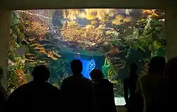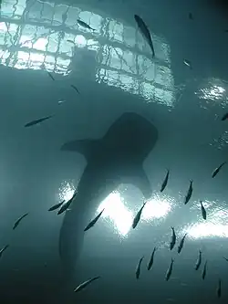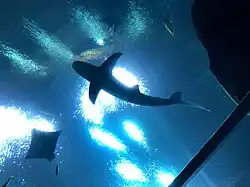 The aquarium's notable specimens include whale sharks, beluga whales, California sea lions, bottlenose dolphins, manta rays, sea otters, and tiger sharks.[4][5] Its centerpiece is a 6.3 million US gallons (24,000 m3) whale shark exhibit.[6][2]