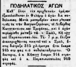 Newspaper article indicating the 3rd place of Georgios Paraskevopoulos in the 12 hour cycling race of the 1896 Olympic Games having completed 940 laps.