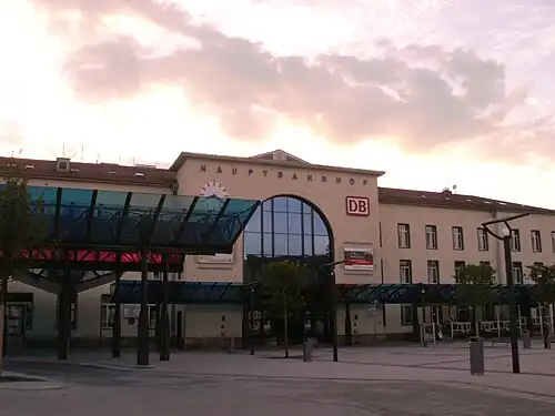 Gera Central Station[4] (Gera Hauptbahnhof) is the main station of the Thuringian town of Gera. Gera is one of the largest cities in Germany with no long-distance rail connections and no electrified lines. The station is a significant regional transport hub. The station is classified by Deutsche Bahn as a category 3 station.