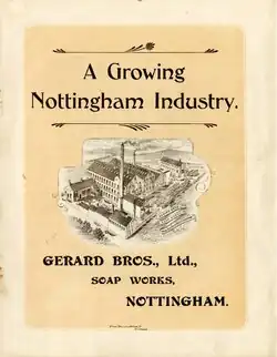 Gerard Bros. Ltd. was a manufacturer of personal healthcare products. The business was founded in 1876[1] and incorporated in 1897,[2] and Thomas Bruges Gerard was voted its first chairman. The company established a factory in Wilkinson Street, New Basford, Nottingham. The factory was built on a 14-acre (57,000 m2) site and pumped water from the River Leen. In 1921 the factory was severely damaged by fire,[1] but the subsequent rebuild afforded the opportunity to expand the factory.[3]