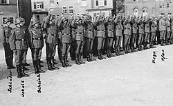 On 28 March 1940, Werner Blankenburg of the Kanzlei des Führers der NSDAP (KdF) wrote to Major Gerhard Engel, Hitler's army adjutant, noting the problems for morale caused by the treatment of "half-Jews" and "quarter-Jews" while on leave, and the consequent risks associated with their having accessing to military secrets, proposing the exclusion of "half-Jews" from the Wehrmacht.[14] On 8 April 1940, Hitler issued a secret directive to the Wehrmacht instructing it to immediately purge all "half-Jews" and soldiers married to "half-Jews" other than in special cases.[6] "Half-Jews" could be granted various dispensations enabling them simply to remain in the Wehrmacht; to remain and be promoted; or to remain, be promoted, and be entitled to declare themselves "of German blood".[20] "Quarter-Jews" and soldiers married to "quarter-Jews" were permitted to remain[6] but were prohibited from serving as non-commissioned officers.[21] Some personnel duly turned themselves in; on one occasion, a commanding officer summarily executed a Jewish soldier, "infuriated at having his ranks sullied". Some commanding officers ignored the directive.[22] Enforcement varied across the Wehrmarcht; the decree was entirely ignored in the Afrika Korps, while implementation was postponed in the Kriegsmarine.[23] Some personnel of Jewish descent falsified papers and concealed their circumcisions.[24] In September 1940, the Oberkommando des Heeres (OKH) stated that "again and again cases have come to the attention of the OKH in which Jewish Mischlinge of the first degree (50%) or soldiers married to such Jewish Mischlinge are still in active military service in violation of the [8 April 1940] order" and insisted that all active personnel sign a declaration relating to their racial status.[6] It is estimated that tens of thousands of personnel of Jewish descent remained in the Wehrmacht following the directive.[6]