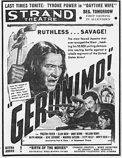 Geronimo (full title: Geronimo: The Story of a Great Enemy) is a 1939 American Western film starring Chief Thundercloud as Geronimo, the famous leader of Apache warriors who fought against American colonizers. It was directed by Paul Sloane. This is the first film depiction of Geronimo's life.