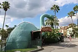 McCay's son Robert unsuccessfully attempted to revive Gertie with a comic strip called Dino.[76] He and Disney animator Richard Huemer recreated the original vaudeville performance for the Disneyland television program in 1955;[72] this was the first exposure the film had for that generation. Walt Disney expressed to the younger McCay his feeling of debt, and gestured to the Disney studios saying, "Bob, all this should be your father's."[91] An ice cream shop in the shape of Gertie sits by Echo Lake in Disney's Hollywood Studios at Walt Disney World.[92] The first known specimen of the dinosaur Chindesaurus, discovered in Arizona's Petrified Forest National Park in 1985, has been nicknamed Gertie after the cartoon, although unlike Gertie, Chindesaurus is not a sauropod.[93]