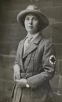 Gertrude Mary Powicke was born on 19 December 1887 in Hatherlow, near Stockport, UK.[2] She was educated in Milton Mount College in Gravesend, Kent.[3] She was one of the early women graduates from the Victoria University of Manchester, gaining a degree in Modern Languages in 1911.[3] She then worked as a teacher at the Manchester High School for Girls.[1] She became a suffrage campaigner with the National Union of Women's Suffrage Societies (NUWSS) and was the co-founder and treasurer of the Romiley branch of the North of England Women's Suffrage Society.[1] During the First World War, she volunteered to work with the Quaker nurses of the Friends War Victims Relief Committee (FWVRC)[4] in Bar-le-Duc, France. She travelled with the FWVRC to Poland in 1919 to treat a typhus outbreak and contracted the disease herself during a hospital tour.[3] She died of typhus in Warsaw, Poland, on 20 December 1919.[5] Her death was not officially recognised by the British government or the Commonwealth War Graves Commission.[6] Powicke is buried in Warsaw's Evangelical-Reformed cemetery and she also has an inscription on the Powicke family grave in Hatherlow churchyard.[1]