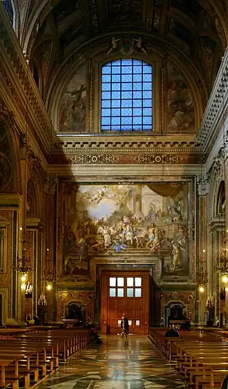 The vault frescos, representing biblical and saintly narratives that exalt the name of Jesus, were carried out by Belisario Corenzio and Paolo de Matteis. At the back of the facade is The Expulsion of Heliodorus from the Temple (1725), a baroque masterpiece by Francesco Solimena. On the four pillars which support the dome are frescos of the four Evangelists, carried out by Giovanni Lanfranco. The inside of the dome had also been decorated by Lanfranco, but this was destroyed in the earthquake of 1688. Paolo de Matteis then repainted a new dome.[2][3] The frescos of the life of the Virgin, placed on the second part of the vault up to the apse, are by Massimo Stanzione.