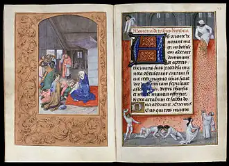 The Ghent–Bruges school is a distinctive style of manuscript illumination which was prevalent in the Southern Netherlands (mainly present-day Belgium) from about 1475 to about 1550,[1] by which point the long tradition of manuscript miniature painting was virtually extinct, displaced by the printed book. Though the name highlights the importance of Ghent and Bruges as centres for manuscript production, manuscripts in the style were produced in a wider area.[2]