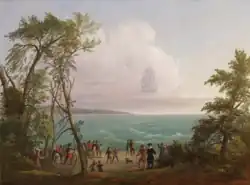 As the New Haven Colony was settled from Massachusetts and not from England, the colony had no ship and thus no way to trade except through Massachusetts. Theophilus Eaton, Stephen Goodyear, and other merchants accordingly commissioned the construction of a 150 ton ship in Rhode Island. The ship's maiden voyage did not start out well, as the winter of 1647 was unusually cold, and the water had frozen over. The crew had to hack the ice with axes and saws for three miles to create a channel to haul the ship backwards to the Long Island Sound. Even after the ship was freed from the ice it had to be towed into the sound. Upon seeing the ship's sorry state, the Reverend John Davenport is said to have said "Lord, if it be thy pleasure to bury these our Friends in the bottom of the Sea, they are thine; save them!"[1] The ship sailed for England with a cargo that included wheat, peas, pelts, and writings from Davenport and Thomas Hooker.[2][2]