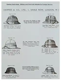- 1850 – Having handed his business over to his nephews, by 1850 Hawkes & Co is being run by H. T. White. As the personal tailor of Sir Garnet Wolseley, he develops a special form of the pith helmet known as the Wolseley pattern, which has an extended brim at the rear for better sun protection for the neck. It is still worn today by the Royal Marines as formal dress.[7]