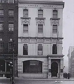 - 1912 – On 23 December, №1 Savile Row is purchased from the Royal Geographical Society by Hawkes & Co. for £38,000,[7] in part because the firm has dressed so many explorers. This was at a time when the international reputation of Savile Row, the famous street and centre for fine craft tailoring was growing.[20] Another £10,000 is spent on converting the premises to suit the business. Hawkes & Co. is appointed to dress the Honourable Corps of Gentlemen at Arms, the British Monarch's nearest bodyguard.