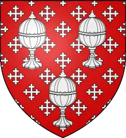 ![]() Arms of Giles d'Argentan: Gules, crusily and three covered cups argent.[1] | |