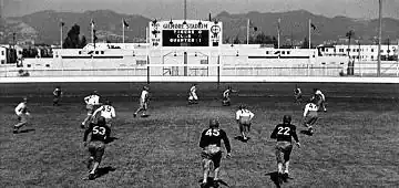 It was the home of the Los Angeles Bulldogs, the first professional football team in Los Angeles.[4] The Bulldogs competed as an independent team before joining the second American Football League in 1937 and winning its championship with a perfect 8–0–0 record, the first professional football team to win its championship with an unblemished record.[5] After the collapse of the league, the Bulldogs returned to being an independent team before joining the American Professional Football Association in 1939.[5] The Bulldogs then became charter members of the Pacific Coast Professional Football League in 1940[6] and played in Gilmore Stadium until 1948, when the team moved to Long Beach, California, for its (and the league's) final season.