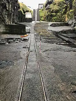 The incline railway operates a narrow-gauge line from the low-level harbour inside the gorge, up a steep incline to the boathouses of the upper village. The line terminates just in front of the village coffee house (Gjáarkaffi). There are no locomotives, and motive power is provided by a winch operating a rope which is attached to the goods wagons. Although the railway is designed for freight transportation, it is a common sight to see local people riding on the wagons with the freight. The winch house is located at the top of the incline, overlooking the gorge. The rope passes from the winch house to the pivot through an underground channel, the route of which may be observed as a series of metal plates set into the road surface. From the pivot onwards the rope is attached to the wagons, and on the incline section of the line it passes over rollers set centrally between the rails of the permanent way.