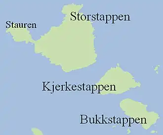 Storstappan rises to a height of 283 metres (928 ft) above sea level and has a peninsula called Stauren that rises to 165 metres (541 ft). Kjerkestappen rises to an elevation of 166 metres (545 ft) above sea level and Bukkstappen rises to 92 metres (302 ft) above sea level. Historically, there were people that lived on the islands and there was a church on Kjerkestappen.