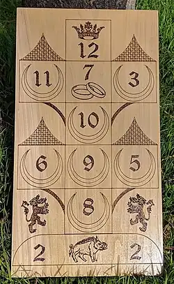 The board is divided in fields numbered from 2 to 12 (with 4 often left out), arranged in the form of the rooms of a house. Each player rolls two dice.