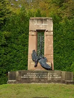 The Glade of the Armistice (French: Clairière de l'Armistice) is a French war memorial in the Forest of Compiègne in Picardy, France, near the city of Compiègne approximately 60 kilometres (37 mi) north of Paris.[1] It was built at the location where the Germans signed the Armistice of 11 November 1918 that ended World War I. During World War II, Adolf Hitler chose the same spot for the French and Germans to sign the Armistice of 22 June 1940 after Germany won the Battle of France. The site was destroyed by the Germans but rebuilt after the war.