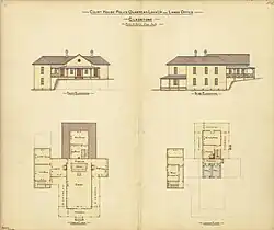 O'Connell first conducted court matters from his tent office at Barney Point. Within a few months he had acquired a slab and shingled building on the rise of Auckland Hill - illegally erected by storekeeper Richard Palmer on a crown reserve, prior to O'Connell's arrival - as Gladstone's first court house and public building. About 1860 this building appears to have been replaced with a purpose-designed court house and watch house. This in turn was demolished in 1873–1874 and replaced with a two-storeyed timber building, which accommodated both the courthouse and the lands office. The 1873–1874 building was situated on the present court house reserve, but at the northern end of the block, overlooking Auckland Inlet, and was accessed via a lane from Auckland Street. The building was extended in 1882–1883, and served as the Gladstone Court House until the early 1940s, when it was replaced with a two-storeyed brick building.[1]