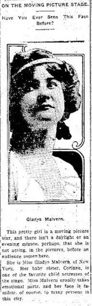 Young Gladys Malvern won her first role on a New York stage at the age of three. In 1908, at age 11, Gladys appeared at the Circle Theater on Broadway in The Man Who Stood Still.[2] By 1910, the two Malvern sisters were working regularly in traveling vaudeville productions, as well as in the burgeoning New York movie industry; Gladys as an ingenue and Corinne as "fairies, babies, witches, and other funny little people."[3] By the age of 14, Gladys began playing leading roles in traveling stock theater companies. Her fellow troupers called her "the youngest stock leading woman in the business."[4] When interviewed about this period in her life, Malvern is quoted as saying: