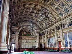 The ornate banqueting hall, which is 33.5 m (110 ft) long by 14.6 m (48 ft) wide and 15.8 m (52 ft) high, is decorated with huge murals by the Glasgow Boys.[5] The decoration was co-ordinated by architect William Leiper.[15] The room hosted Nelson Mandela and Sir Alex Ferguson when they received the Freedom of the City in 1993 and 1999, respectively.[5] In March 2015, it hosted the medal ceremony for Bob Fulton, Robert Somerville and John Keenan, three retired Rolls-Royce factory workers, honoured for their boycott against the Chilean Air Force during the dictatorship of General Pinochet of Chile. The ceremony is part of the documentary Nae Pasaran.[16] The Council Chamber is clad in Spanish mahogany panelling and its windows are made of Venetian stained glass.[5]