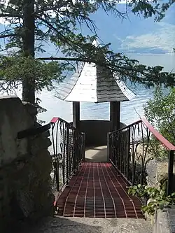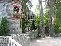 The Glass House, built by David H. Brown, is located on the east shore of Kootenay Lake in British Columbia near the rural locality of Boswell, British Columbia. Construction started in 1952[1] in order to, according to a quote left by Mr. Brown, "indulge a whim of a peculiar nature". Intended to be the Browns' home, the unusual construction and fantasy-castle appearance attracted traffic from the adjacent British Columbia Highway 3A (now part of the scenic International Selkirk Loop[2]). The resulting loss of privacy led to the Browns' establishment of a roadside attraction in the summer months.