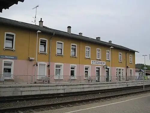 Glauburg-Stockheim station is a station on the Gießen–Gelnhausen railway in the town of Glauburg in the German state of Hesse. It is also at the end of the Bad Vilbel–Glauburg-Stockheim railway from Bad Vilbel. The Oberwald Railway (Oberwaldbahn) to Lauterbach began here from 1 October 1888 until 1 June 1984. The station is classified by Deutsche Bahn (DB) as a category 5 station.[1]