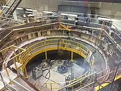 In 1956, work began on the two diversion tunnels that would carry the Colorado River around the dam site during construction. Each of the tunnels was 41 feet (12 m) in diameter, with a combined capacity of 200,000 cubic feet per second (5,700 m3/s); the right-side tunnel was 2,740 feet (840 m) long and the left 2,900 feet (880 m).[55][64] The right tunnel would be used for carrying the Colorado's normal flow around the dam site, while the left tunnel, 33 feet (10 m) above the water, would only be used during floods. The lower reaches of the tunnels would later be used to form the lower ends of the dam's spillways.[65] About 182,000 cubic yards (139,000 m3) of material would have to be excavated from the diversion tunnels.[55]