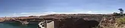 Panorama of Glen Canyon Dam showing Lake Powell, Glen Canyon Dam and Carl Hayden Visitor Center