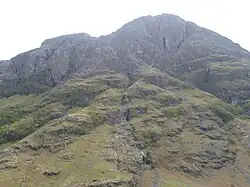 The south side of the glen is marked by a succession of distinct peaks: Buachaille Etive Beag at the eastern end, followed by the Three Sisters, shoulders of the Bidean nam Bian massif which are subdivided by Coire Gabhail and Coire nan Lochan. The name Coire Gabhail (corrie of the bounty, or hollow of capture) refers to former times when the corrie was used by members of Clan MacDonald to hide cattle and other livestock, whether their own or stolen from others. The wide flat glen is well suited for this purpose since from Glen Coe it appears to be a normal v-shaped glen approached only by a steep narrow gorge.[12][13] Summits in the Bidean nam Bian massif include Stob Coire Sgreamhach, Stob Coire nan Lochan and Aonach Dubh (the third "sister").[6] By contrast the north side of the glen is a stark wall of mountain, the Aonach Eagach ridge. The ridge is crossed at the eastern end by the Devil's Staircase, an old military road opposite Buachaille Etive Mòr. The western end terminates with the conical Pap of Glencoe (Sgùrr na Cìche), above Glencoe village, at the point where the glen opens out to Loch Leven.[6]