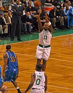 After coming off the bench for the first 19 games of the season, Davis made his first NBA start against the Sacramento Kings on December 12, 2007, in place of injured center Kendrick Perkins.[5][6] Playing at power forward with Kevin Garnett taking Perkins' place at center, he scored 16 points and pulled down 9 rebounds as the Celtics won the game 90–78.[7][8] His breakout performance took place against the Detroit Pistons on January 5, 2008, as he scored 16 of his 20 points in the fourth quarter, including the last basket of the game.[9][10] The Celtics would win the 2008 NBA Finals in Davis's rookie season by defeating the Los Angeles Lakers in six games in the finals.[11]
