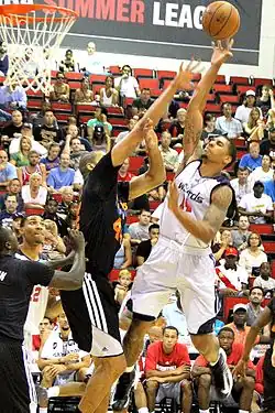 Following his first season, Rice was available to the Wizards on a team option for a salary of $816,000.[84] Rice joined the team for the 2014 NBA Summer League, where he averaged a league-leading 25 points as well as 7.8 rebounds, 2.5 steals and 2.3 assists.[85] He earned NBA All-Summer League 1st team (along with Wizards teammate Otto Porter) and NBA Summer League MVP recognition.[86] One of his highlights was a game-tying three-point shot in double overtime of the Summer League playoff quarterfinal game.[87] However, with the offseason acquisition of Paul Pierce, both Rice and Porter were expected to see limited minutes at small forward during the 2014–15 regular season.[88] Rice was the recipient of what the league ruled was a November 4 groin strike by J. R. Smith that led to a one-game suspension for Smith. Rice had been called for a personal foul on the play in a game against the New York Knicks.[89][90] On November 20, 2014, he was assigned to the Fort Wayne Mad Ants of the NBA Development League.[91] On January 7, 2015, he was waived by the Wizards.[92]