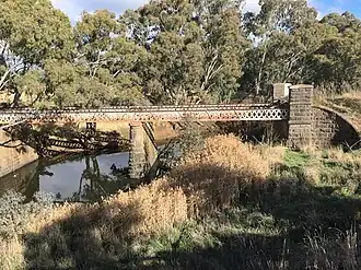 The continuous trusses are 46.6 metres long and the piers are quite tall at 10.1 metres high.[3] It is the third-oldest of its type in Victoria. Its location is directly south of the new bridge over the Bet Bet on the Pyrenees Highway.[4]
