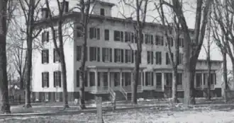 The school was originally across the street from its later location at 10 Church Street.[4] A one-room schoolhouse, in a 44-foot-by-26-foot structure, was erected in 1838. As noted in the 1838 catalogue for the school details were as follows:[4] Enrollment began on May 2, 1838.[4] The class enrollment was 84 students, with 45 boys and 39 girls. The trustees of the school were Rev. Joseph L. Shafer, William Little, Elihu Baker, Asbury Fountain, and Garrett P. Conover. The teachers were Philetus Phillips (the principal from 1836 to 1844), Thomas H. Shafer, M. Louise Cox, and Cynthia P. Collins. The academic year was divided into four terms of eleven weeks.