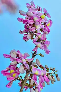 Gliricidia sepium, often simply referred to as gliricidia or by its Spanish common name madre de cacao (calque of Nahuatl cacahuanāntli;[2] also anglicized as mother of cocoa),[3] is a medium size leguminous tree belonging to the family Fabaceae. It is an important multi-purpose legume tree,[4] with a native range from Mexico to Colombia, but now widely introduced to other tropical zones.[5]
